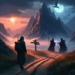 Eines Tages ging ein Wanderer seiner Wege, und an einer Wegkreuzung traf er auf zwei Gestalten. Sie standen mit dem Rücken zu ihm und starrten auf den Wegweiser, welcher an der Gabelung angebracht war und die Wege zu jenen fernen und nicht ganz so fernen wie auch zu nahen Städten wies, und zudem waren auch Städte die der Wanderer nicht ..